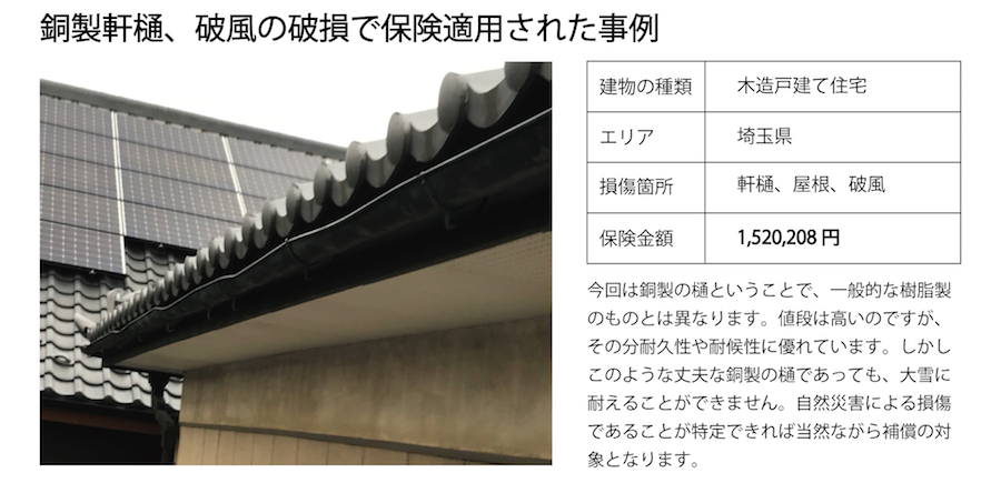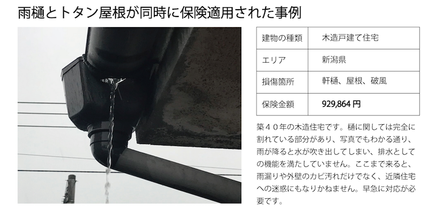 保険会社が『この雨樋の損傷は自然災害によるものだ!』と認定すればその修復費用として保険金を受取ることができます。全てを認められたら自己負担ゼロ、一部を否認されたとしても大幅に自己負担を減らすことができます。